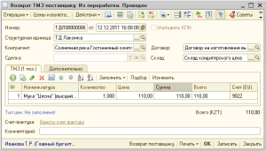 Шаг 5: В случае если по завершению процесса производства продукции из давальческого сырья остались неиспользованные материалы заказчика, то необходимо оформить операцию по возврату таких материалов с помощью документа «Возврат ТМЗ поставщику» с видом операции «Из переработки» (меню Покупка – Возврат ТМЗ поставщику).