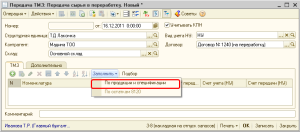 Шаг 1: Операцию по передаче собственных материалов организации-переработчику на изготовление продукции из собственного сырья можно отразить с помощью документа «Передача ТМЗ» с видом операции «Передача сырья в переработку» (меню Производство – Передача в переработку (из переработки)).