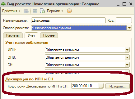 - В карточке вида расчета указывается код строки для отражения начислений в Декларации. Строка 200.00.001 «Начисленные доходы» заполняется в зависимости от указанного значения в сроке «Код строки Декларации по ИПН и СН».