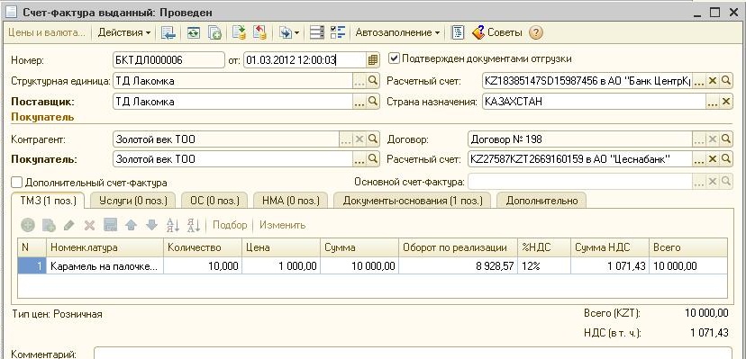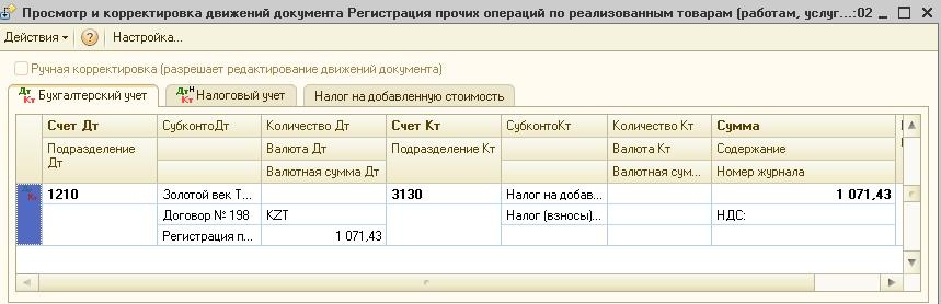 При проведении документа сформируются записи в регистр накопления «Налог на добавленную стоимость» и проводки по увеличению НДС начисленного.