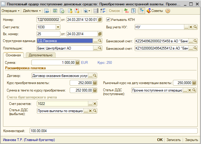 В момент оплаты курс валюты оказался ниже курса последней переоценки. Поэтому остаток валютных средств был переоценен документом по новому курсу, что привело к образованию отрицательной курсовой разницы в размере 60 000 тг.