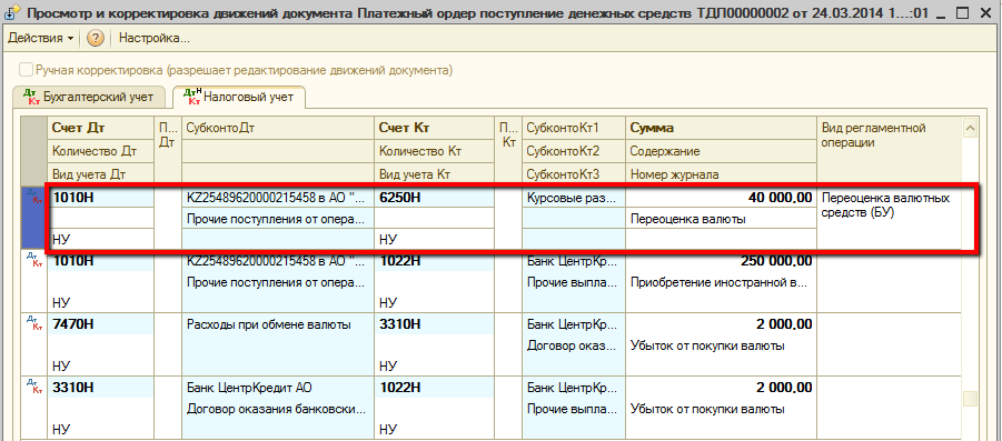 Имеющаяся ранее валюта была переоценена по новому курсу, что провело к образованию положительной курсовой разницы в размере 40 000 тг.