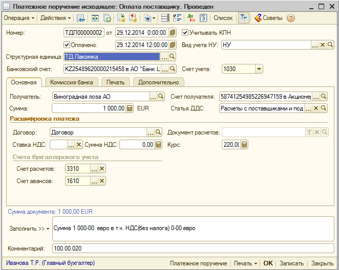 Отрицательная курсовая разница образовалась при оплате поставщику в валюте. Оплата оформлена документом Платежное поручение исходящее.