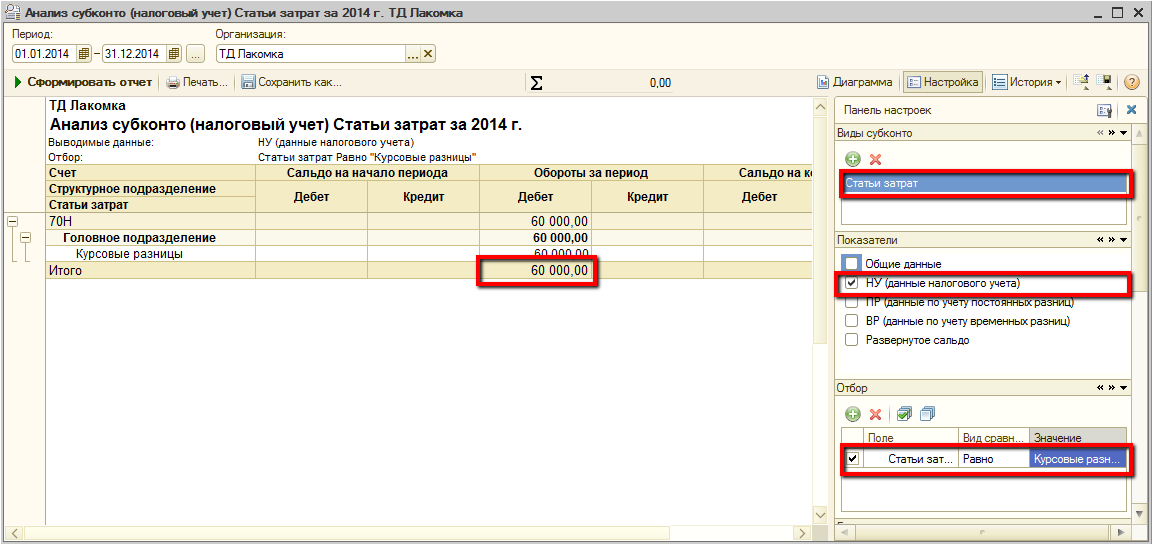 Проверить корректность расчета и отражения курсовых разниц можно при помощи отчета Анализ субконто (НУ).