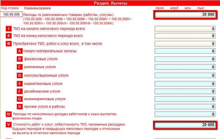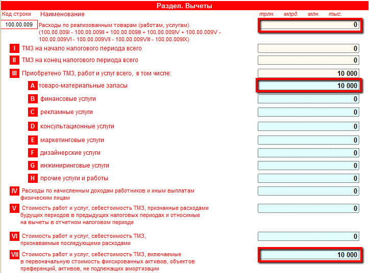 Пример: В отчетном периоде организацией приобретены ТМЗ на сумму 10 000 тг. Данные ТМЗ использованы в строительстве собственного здания. Стоимость приобретенных ТМЗ отразится по строке 100.00.009IIIA, отнесение стоимости ТМЗ на строительство отразится по строке 100.00.009VII. Таким образом, в строке 100.00.009 вычет по ТМЗ, использованным в строительстве не образуется.