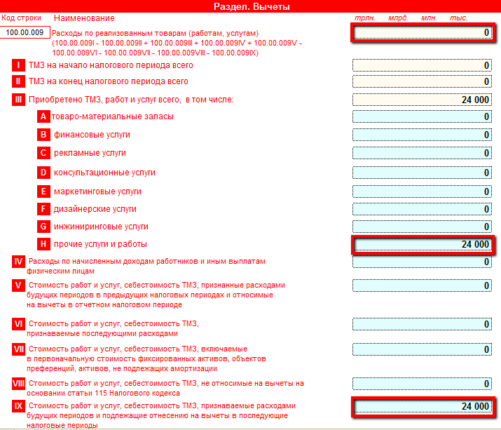 Пример: Организация в 2013 году приобрела услуги на сумму 24 000 тг. Данные услуги признаны расходами будущих периодов, относимые на вычеты в 2014 году. Приобретенные РБП в 2013 году отразились по строке 100.00.009IIIH и 100.00.009IX. Таким образом, в 2013 году приобретенные РБП не образовали вычета по строке 100.00.009.
