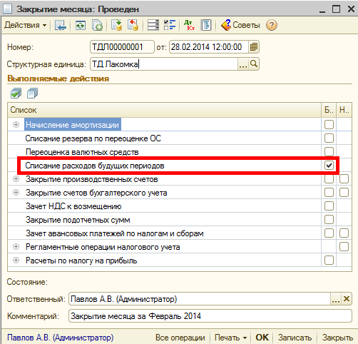 Списание РБП осуществляется документом Закрытие месяца. В документе необходимо установить признак «Списание расходов будущих периодов».