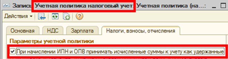 Если в регистре сведений «Учетная политика (налоговый учет)» на закладке «Налоги, взносы, отчисления», установить признак «При начислении ИПН и ОПВ принимать исчисленные суммы к учету как удержанные», то сумма исчисленного налога будет равна сумме удержанного, и ИПН будет перечисляться по фактически начисленной сумме.