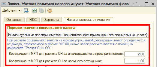 в регистре сведений «Учетная политика по налоговому учету» на закладке «Налоги, взносы, отчисления» должен быть определен порядок расчета социального налога в значении «Индивидуальный предприниматель, за исключением применяющего специальные налоговые режимы», а также, установить для индивидуального предпринимателя и сотрудника коэффициенты минимального расчетного показателя для расчета социального налога;
