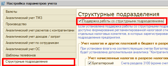 При работе со структурными подразделениями должна быть включена настройка «Поддержка работы со структурными подразделениями», которая находится в меню Предприятие - Настройка параметров учета,закладка «Структурные подразделения».