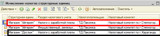 Также необходимо заполнить регистр сведений «Исчисление налогов структурных единиц», в котором для каждого структурного подразделения необходимо заполнить раздел налогового учета, выбрать налогоплательщика и указать налоговый комитет.
