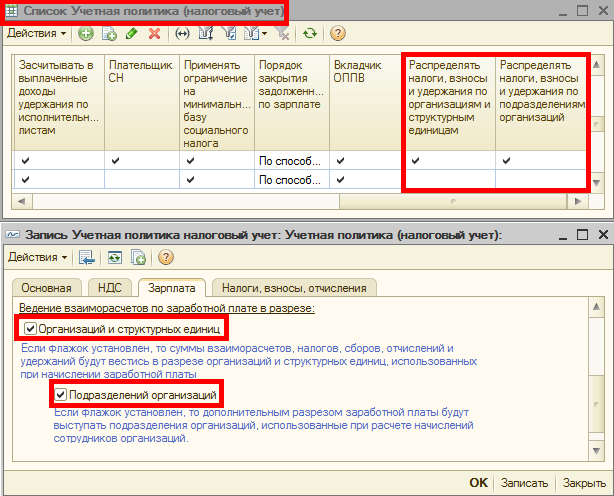 Если в регистре сведений «Учетная политика (налоговый учет)» установлены признаки «Распределять налоги, взносы и удержания по организациям и структурным единицам», «Распределять налоги, взносы и удержания по подразделениям организаций», то суммы взаиморасчетов будут вестись в разрезе организаций и структурных подразделений. То есть, если сотрудник в течение месяца был перемещен из головной организации в структурное подразделение, то суммы налогов, удержаний, будут отражены и в головной организации, и структурном подразделении пропорционально доходам, начисленным в структурной единице.