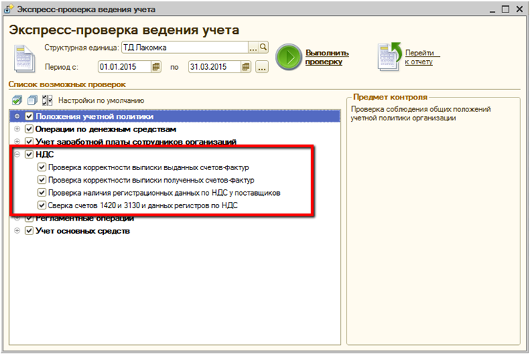 Выполнение проверки позволит проконтролировать соответствие данных счетов-фактур и документов-оснований, проверить заполненность регистрационных данных о постановке на учет по НДС поставщиков и сверить обороты по счетам с соответствующими регистрами по НДС.