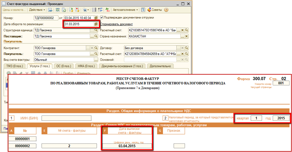 Например, дата совершения оборота - 31 марта 2015 года, оборот относится к 1 кварталу 2015 года. Так как счет-фактура может быть выписан в течение 7 дней на бумажном носителе и 15 дней в электронном виде, предположим, что счет-фактура выписан – 3 апреля (во 2-м квартале 2015 года). При этом такой СФ отразится в реестре по дате совершения оборота - в 1 квартале.