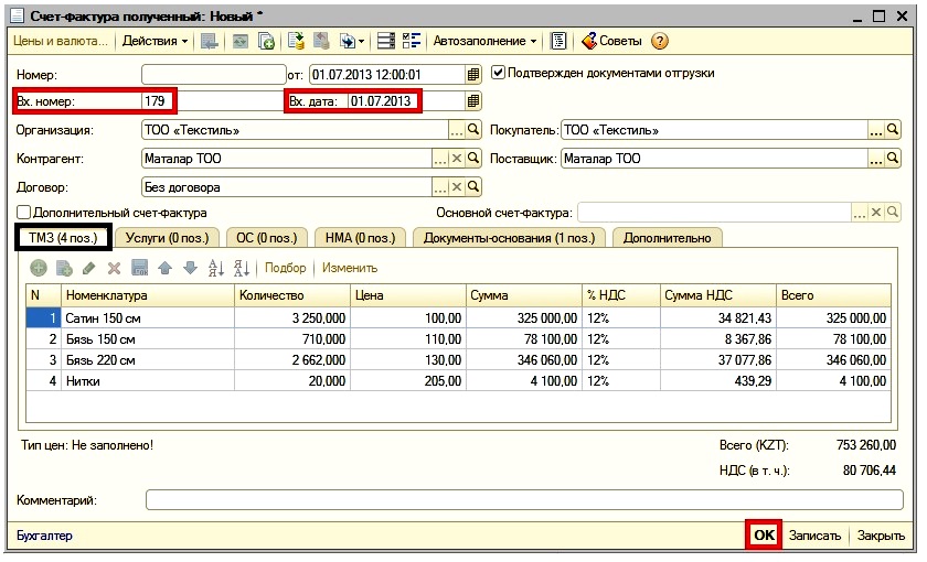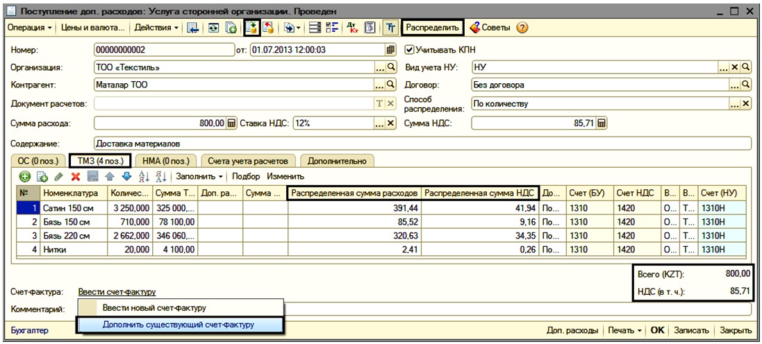 Пример: 1 июля 2013 года в организацию ТОО «Текстиль» поступили материалы от поставщика ТОО «Маталар» (счет-фактура № 179 от 01.07.2013 г.). Стоимость доставки составляет 800 тенге.