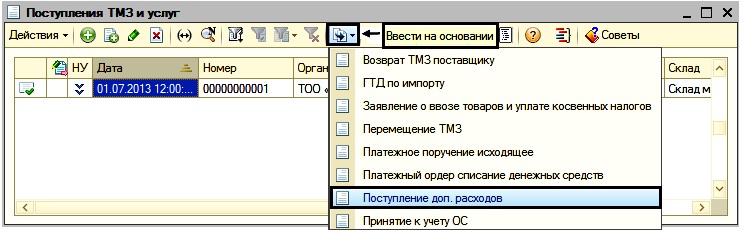 3. Расходы по доставке необходимо включить в покупную стоимость материалов. Для этого предназначен документ «Поступление доп. расходов». Введем его на основании документа «Поступление ТМЗ и услуг» и распределим стоимость доставки (800 тенге) на каждый вид приобретенных материалов. В форме списка «Поступление ТМЗ и услуг» выделим документ от 01.07.2013 г. на сумму 753 260 тенге, щелкнем по кнопке Ввести на основании, расположенной на командной панели и выберем из списка «Поступление доп. расходов» (рис.5).