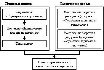 Конфигурация «Зарплата и Управление Персоналом 8 для Казахстана» может также использоваться для создания планов затрат на персонал и построения сравнительного анализа плановых данных с фактическими. В конфигурации может быть создано произвольное количество планов затрат, которые задаются в справочнике «Сценарии планирования» с произвольной периодичностью. Планирование может производиться в разрезе статей затрат и (или) в разрезе подразделений. При создании плана выбирается режим планирования, который определяет, для какого учета – регламентированного или управленческого – создается план. Общая схема подсистемы планирования затрат на персонал приведена ниже.