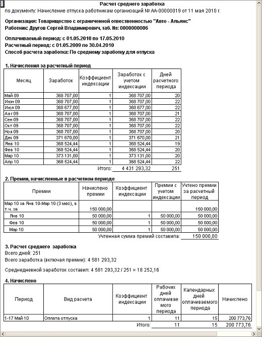 В каждом из вышеперечисленных документов на закладке «Расчет среднего заработка» расположена табличная часть с результатами расчета по каждому месяцу расчетного периода. При этом для премий, начисленных более чем за один месяц, выводится доля премии, приходящаяся на каждый месяц расчетного периода среднего заработка, совпадающий с периодом, за который была начислена премия. Например, если была начислена премия в марте 2010 года сотруднику Другову С.В. за первый квартал 2010 года в размере 150 тыс. тг. При расчете среднего заработка мы увидим, что в табличной части будет в данном случае присутствовать 3 строки с начислением «Премии, полностью учитываемые в ср. заработке (начисленные пропорционально отработанному времени)» с суммой 50 тыс. тг., приходящейся на каждый месяц периода действия премии.