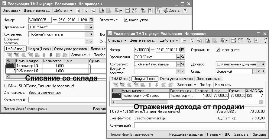 Итак, согласно нашему примеру, компания продавала бонусные комплекты(Телевизор «LG» + DVDплеер (подарок)). Данные в конфигурацию «Бухгалтерия 8 для Казахстана» перенесутся следующим образом: