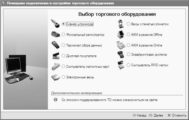 На первом этапе подключения пользователю предоставляется возможность выбрать вид торгового оборудования, работа с которым поддерживается в данном прикладном решении. В нашем случае, необходимо выбрать «Сканер штрихкода».