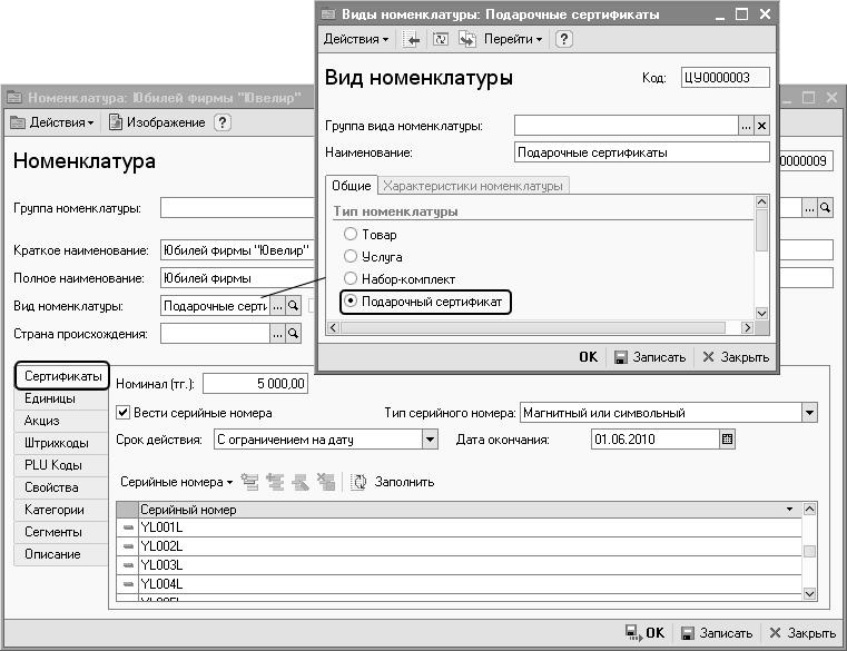 Как только для номенклатуры был указан вид номенклатуры с типом «Подарочный сертификат», то сразу будет доступна закладка «сертификаты», на которой нужно заполнить номинал, срок действия сертификата. Если для сертификатов будет вестись посерийный учет, то необходимо установить флаг «Вести учет по серийным номерам». Сразу появится табличная часть для ввода серийных номеров. Серийные номера могут вводиться вручную или обработкой автоматического заполнения по выбранному диапазону при нажатии на кнопку «Заполнить».