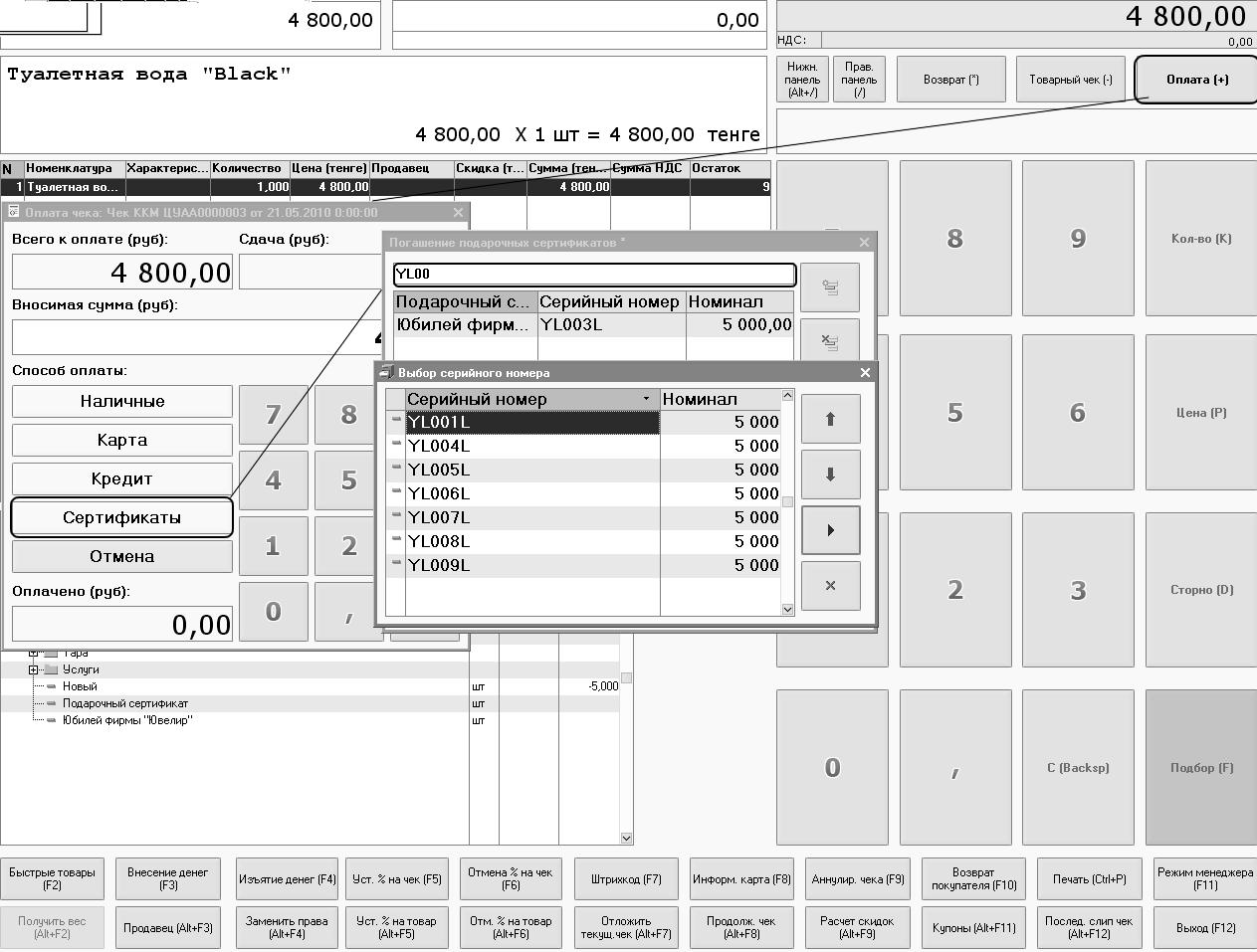 Система помечает подарочный сертификат с заданным серийным номером как проданный и второй раз его продать нельзя.