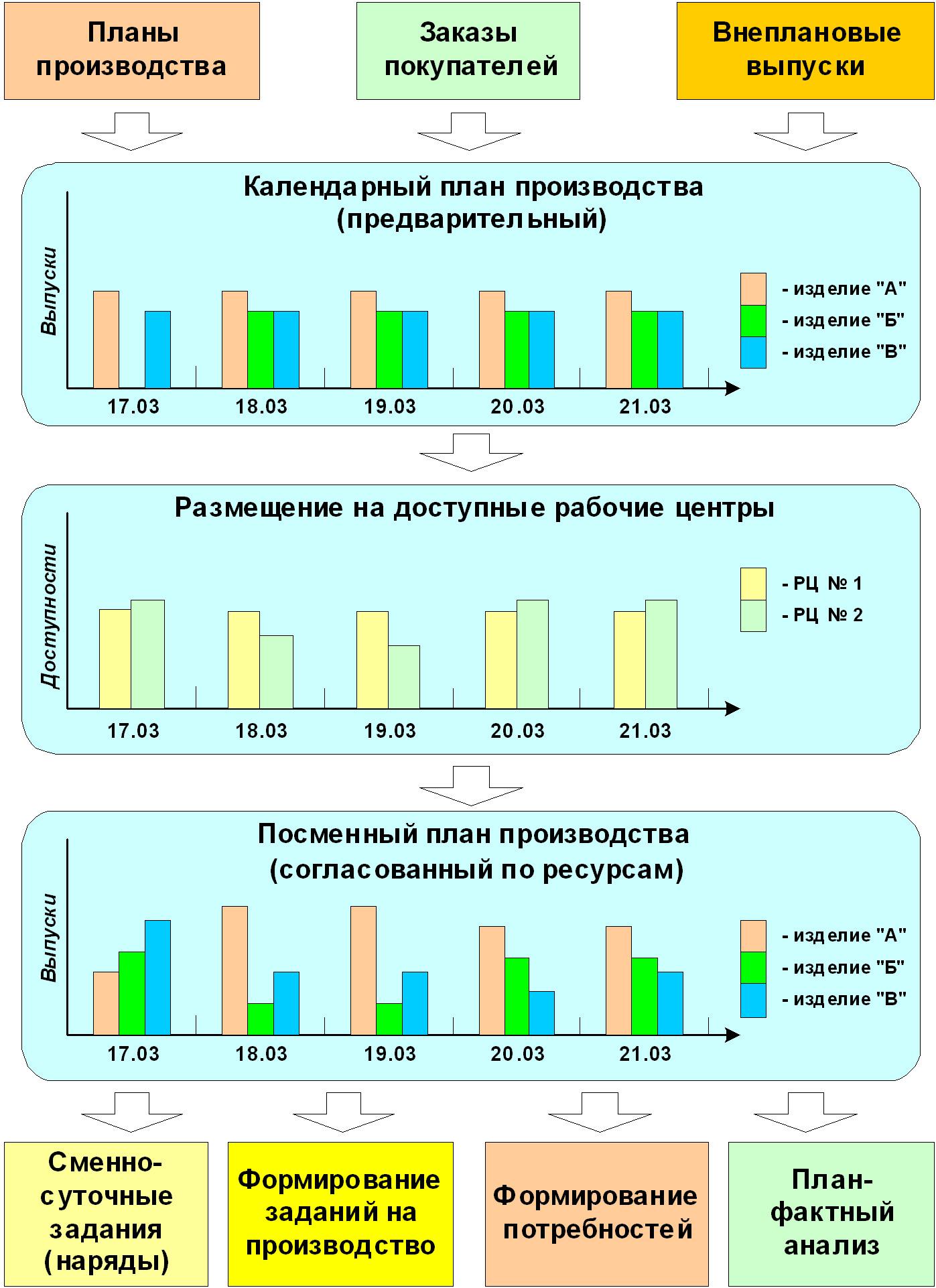 Основная задача подсистемы — «распределить» технологические процессы производства по доступному времени рабочих центров с учетом их графиков работы, производительности и ранее распланированных на них операций. За один цикл одновременно строятся: