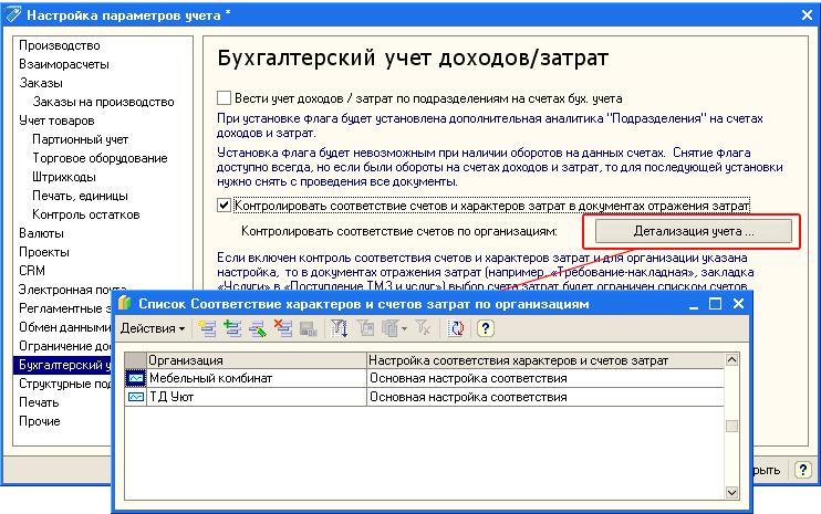 Затем, в регистре сведений «Соответствие характеров и счетов затрат по организациям» для каждой организации указывается своя настройка.