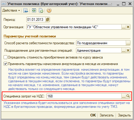 В регистре сведений «Учетная политика (бухгалтерский учет)» необходимо указать специфику, которая будет использоваться в качестве специфики затрат на НДС при формировании бухгалтерских проводок по учету товаров и внеоборотных активов. Следует обратить внимание на то, что при обновлении информационной базы на релиз 3.0.8 в учетной политике по бухгалтерскому учету в качестве специфики затрат на НДС автоматически устанавливается специфика 168.