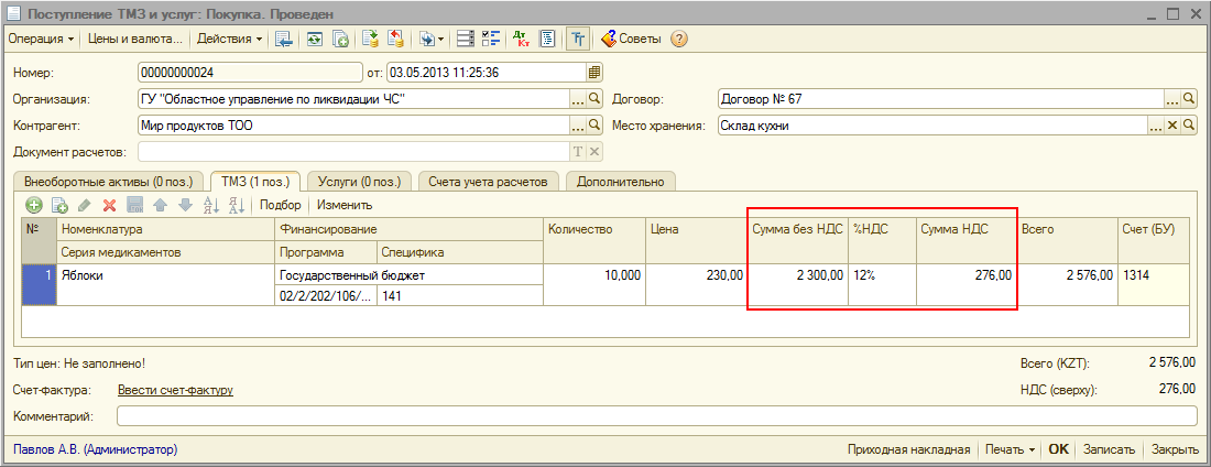 Если используется способ оценки запасов «По средней» и необходимо, чтобы при списании ТМЗ, приобретенных без НДС, затраты по НДС не возникали рекомендуется создавать два элемента справочника «Номенклатура». Например, для яблок, приобретаемых с НДС, необходимо создать номенклатуру «Яблоки с НДС», а для яблок, приобретаемых без НДС – номенклатуру «Яблоки БЕЗ НДС». Тогда документы поступления будут выглядеть следующим образом: