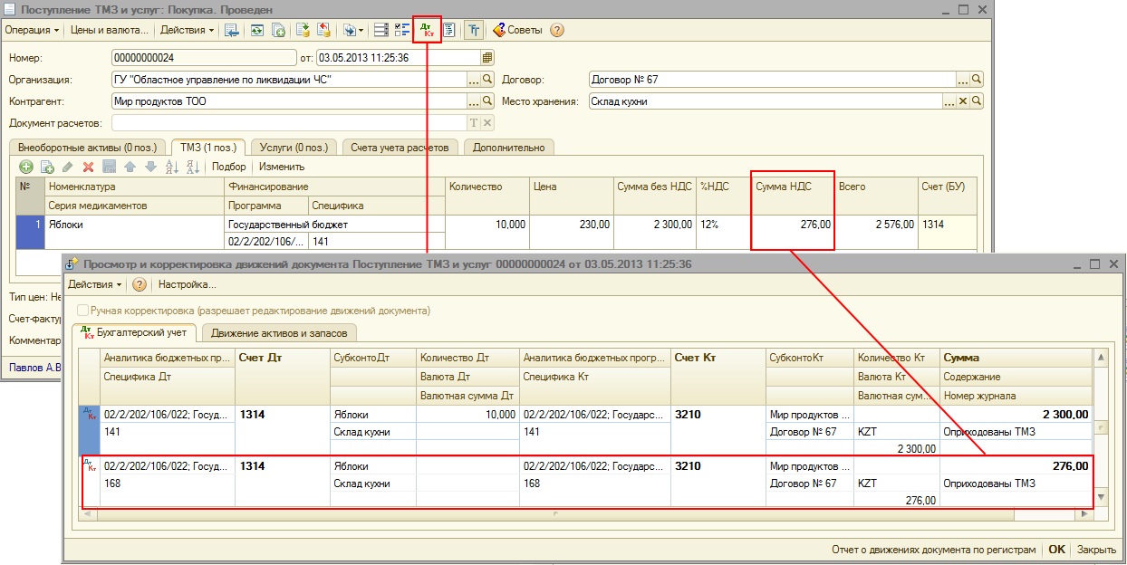Таким образом, начиная с 1 января 2013 года, учет активов и услуг ведется по основным спецификам, по которым приобретаются активы или товары (сумма без НДС) и по специфике 168 (сумма НДС).