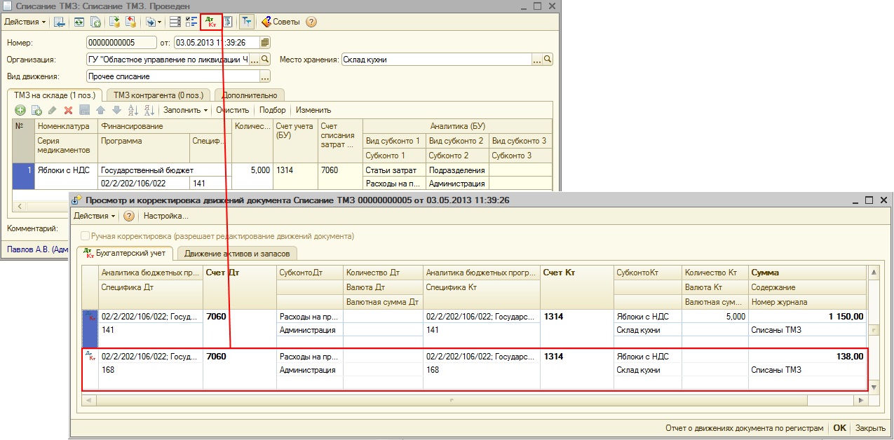 Если же списывается 5 кг номенклатуры «Яблоки БЕЗ НДС», то затраты по специфике 168 не возникнут так как сумма НДС в этом случае будет равна нулю и, следовательно, дополнительная проводка на сумму затрат по специфике 168 при списании сформирована не будет.