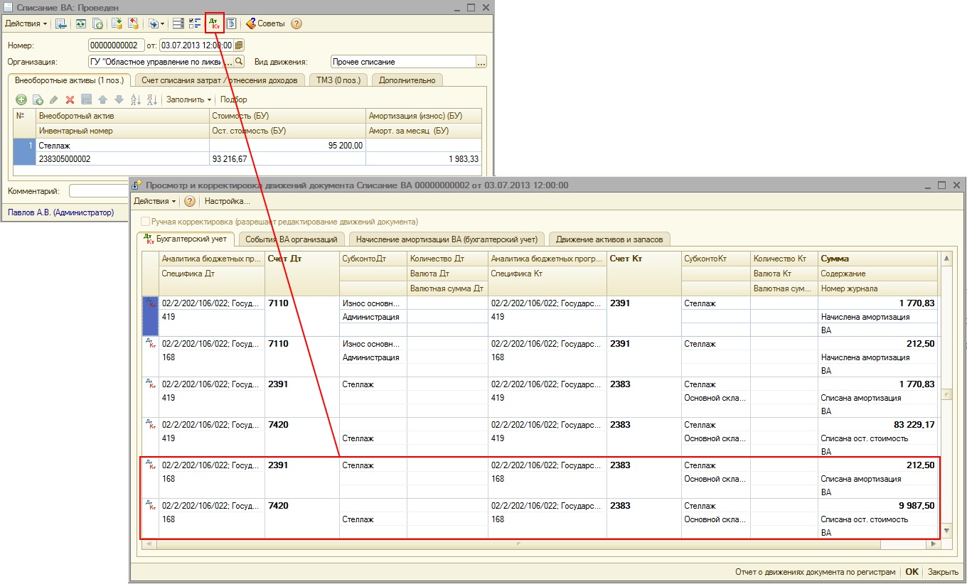 Рассмотрим порядок расчета сумм, относимых на специфику 168 при выбытии долгосрочного актива на примере документа «Списание ВА». При заполнении этого документа, кроме списания стоимости внеоборотного актива, необходимо списать и сумму начисленной амортизации. И так как внеоборотный актив был приобретен с НДС, то при проведении документа списания должны быть сформированы две дополнительные проводки: по списанию стоимости по 168 специфике и по списанию суммы начисленной амортизации также по специфике 168.