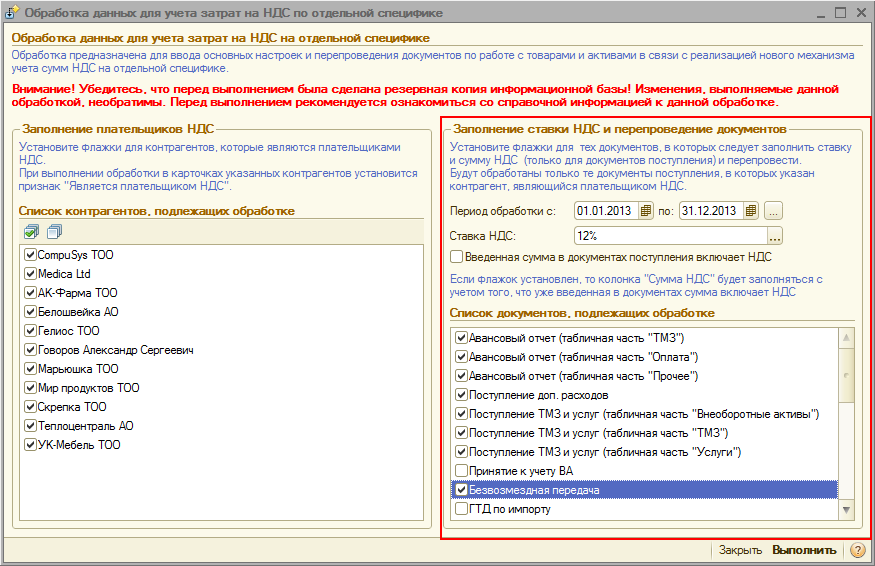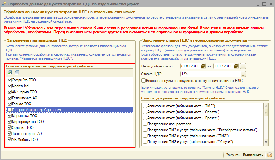 В табличной части «Список контрагентов, подлежащих обработке» будет приведен перечень контрагентов, поставки активов и запасов от которых уже были зарегистрированы в информационной базе. В представленном списке необходимо будет отметить тех контрагентов, которые являются плательщиками НДС.
