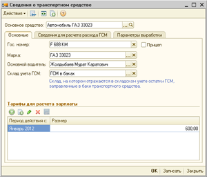 Зададим тарифы в размере 600 тг. в час за работу на автомобиле «ГАЗ 33023» и 500 тг. в час за работу на автомобиле «Микроавтобус Toyota Liticia» на январь 2012 года. То есть установленные тарифы должны действовать, начиная с 1 января 2012 года.
