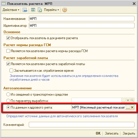 Для того, чтобы показатель «МРП» заполнялся значением месячного расчетного показателя, необходимо в настройках показателя указать соответствующий способ автозаполнения так, как показано на рисунке: