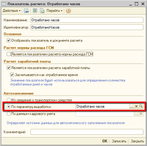 В свойствах заполнения показателя «Отработано часов» установлено правило заполнения «По параметру выработки» и в качестве параметра выработки установлен параметр «Отработано часов»:
