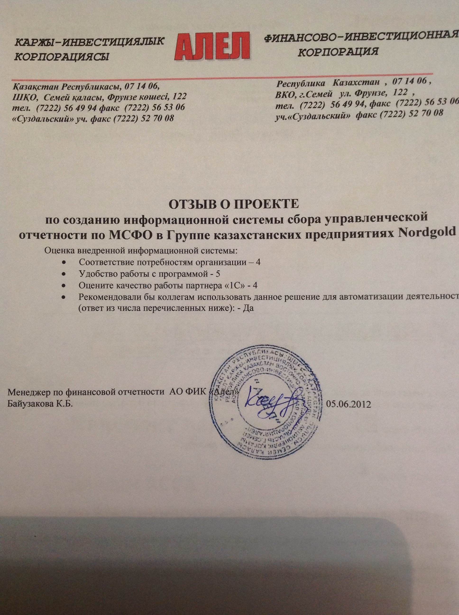 Компания «1С-Рейтинг» закончила внедрение информационной системы сбора управленческой отчетности по МСФО на казахстанских предприятиях, входящих в состав компании Nordgold.