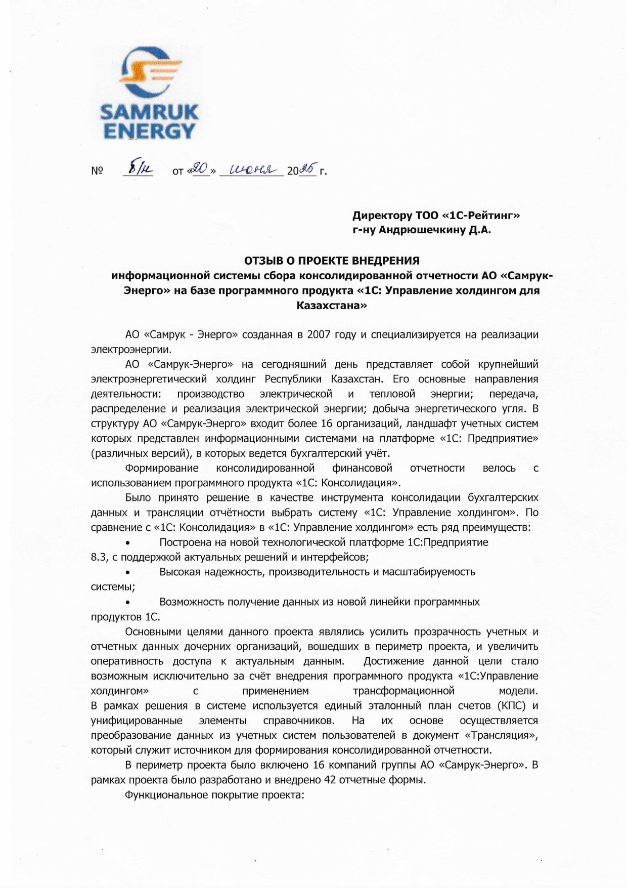АО «Самрук-Энерго» на сегодняшний день представляет собой крупнейший электроэнергетический холдинг Республики Казахстан. Его основные направления деятельности: производство электрической и тепловой энергии; передача, распределение и реализация электрической энергии; добыча энергетического угля. В структуру АО «Самрук-Энерго» входит более 16 организаций, ландшафт учетных систем которых представлен информационными системами на платформе «1С:Предприятие» (различных версий), в которых ведется бухгалтерский учёт.