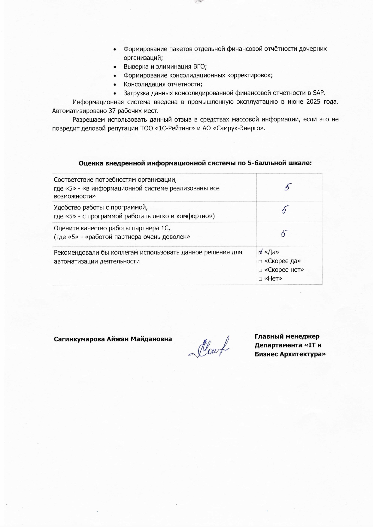 В периметр проекта было включено 16 компаний группы АО «Самрук-Энерго». В рамках проекта было разработано и внедрено 42 отчетные формы.