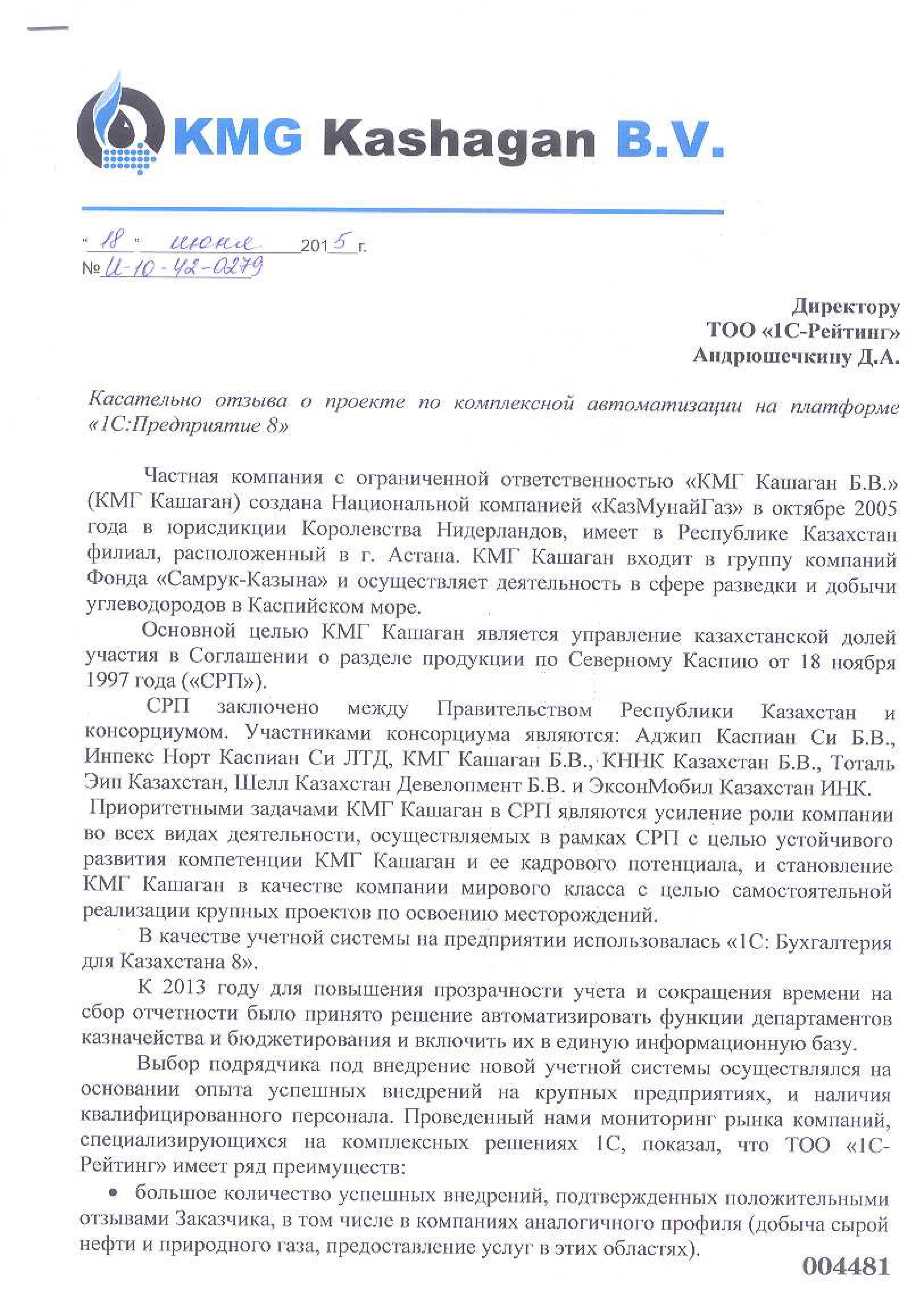 Специалистами компании «1С-Рейтинг» завершен проект автоматизации частной компании с ограниченной ответственностью «КМГ Кашаган Б.В.» с помощью отраслевого решения «1С-Рейтинг: Комплексное управление финансами и бюджетирование для Казахстана». В рамках проекта автоматизированы функции департаментов казначейства и бюджетирования, осуществлено их включение в единую информационную базу. В результате внедрения сокращено время на сбор управленческой отчетности и усилен контроль за финансовой деятельностью предприятия.