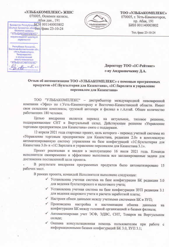 Внедренное типовое решение: «1С:Бухгалтерия для Казахстана», «1С:Зарплата и управление персоналом для Казахстана»