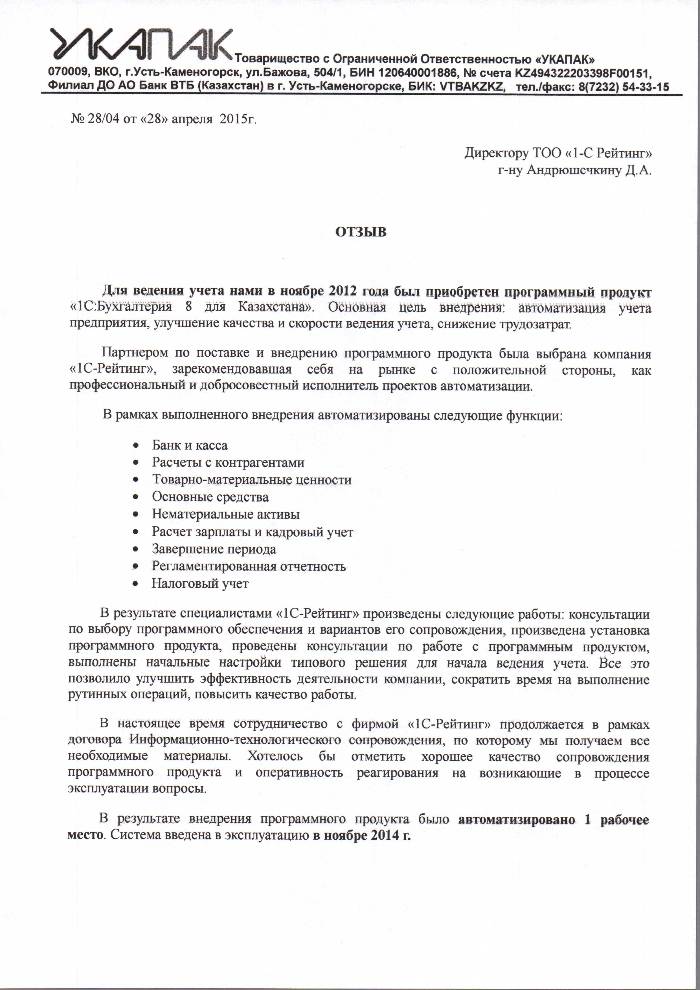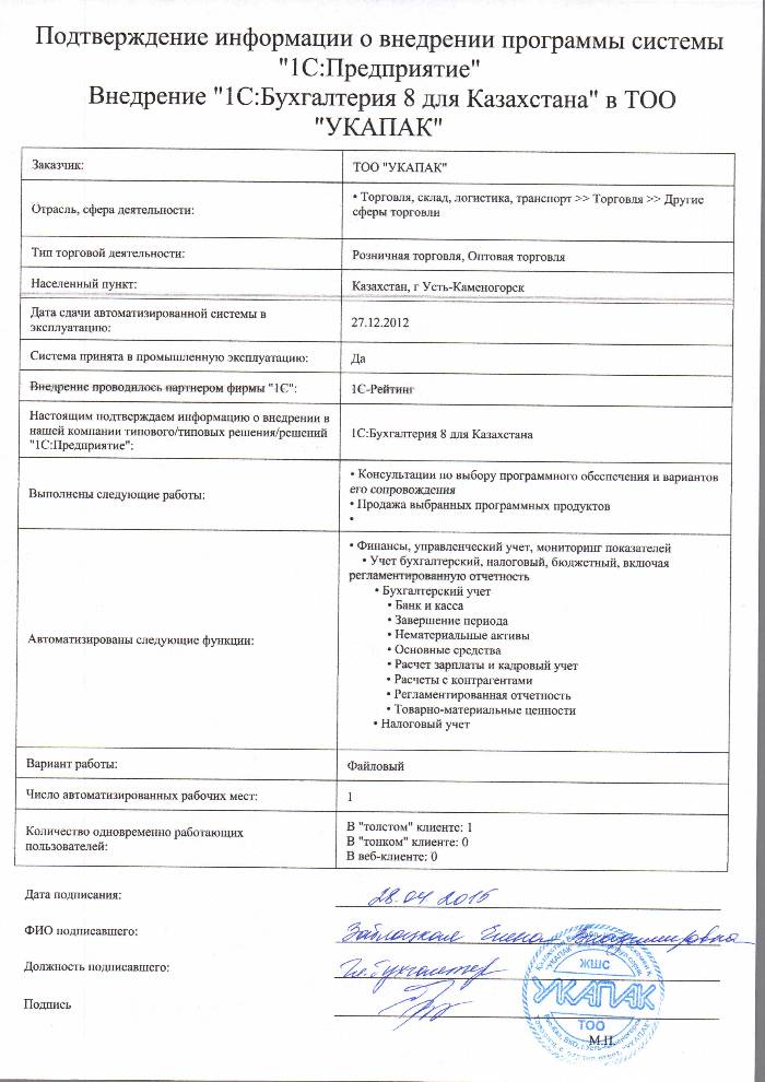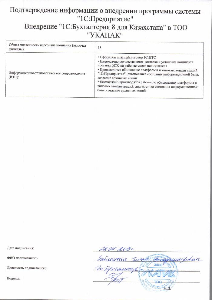 | Внедренное типовое решение: | 1С:Бухгалтерия 8 для Казахстана |