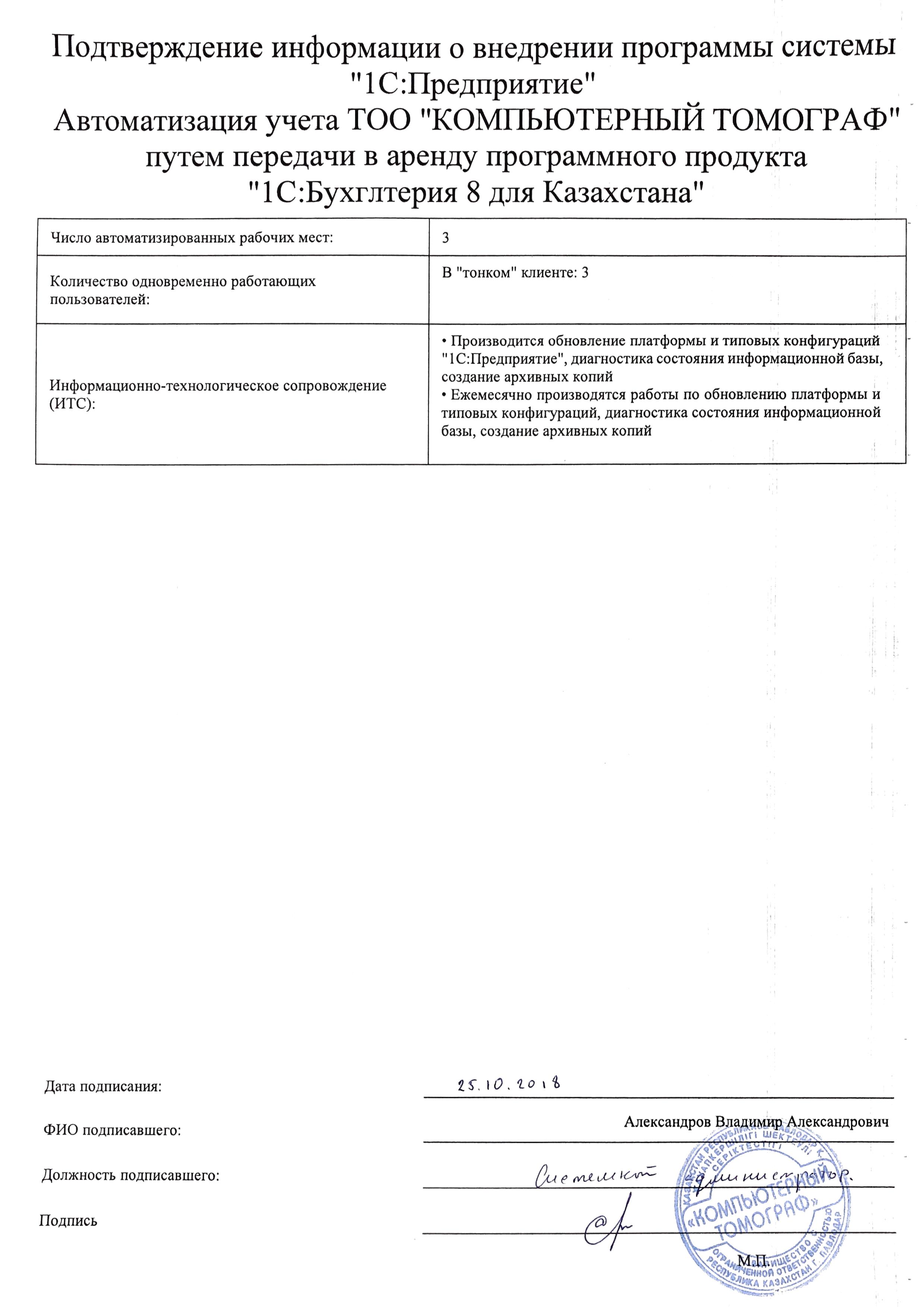 - Ежемесячно производятся работы по обновлению платформы и типовых конфигураций, диагностика состояния информационной базы, создание архивных копий