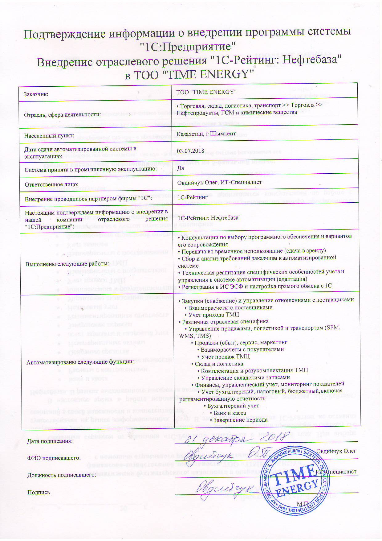 | Внедренное отраслевое решение: | 1С-Рейтинг: Нефтебаза |