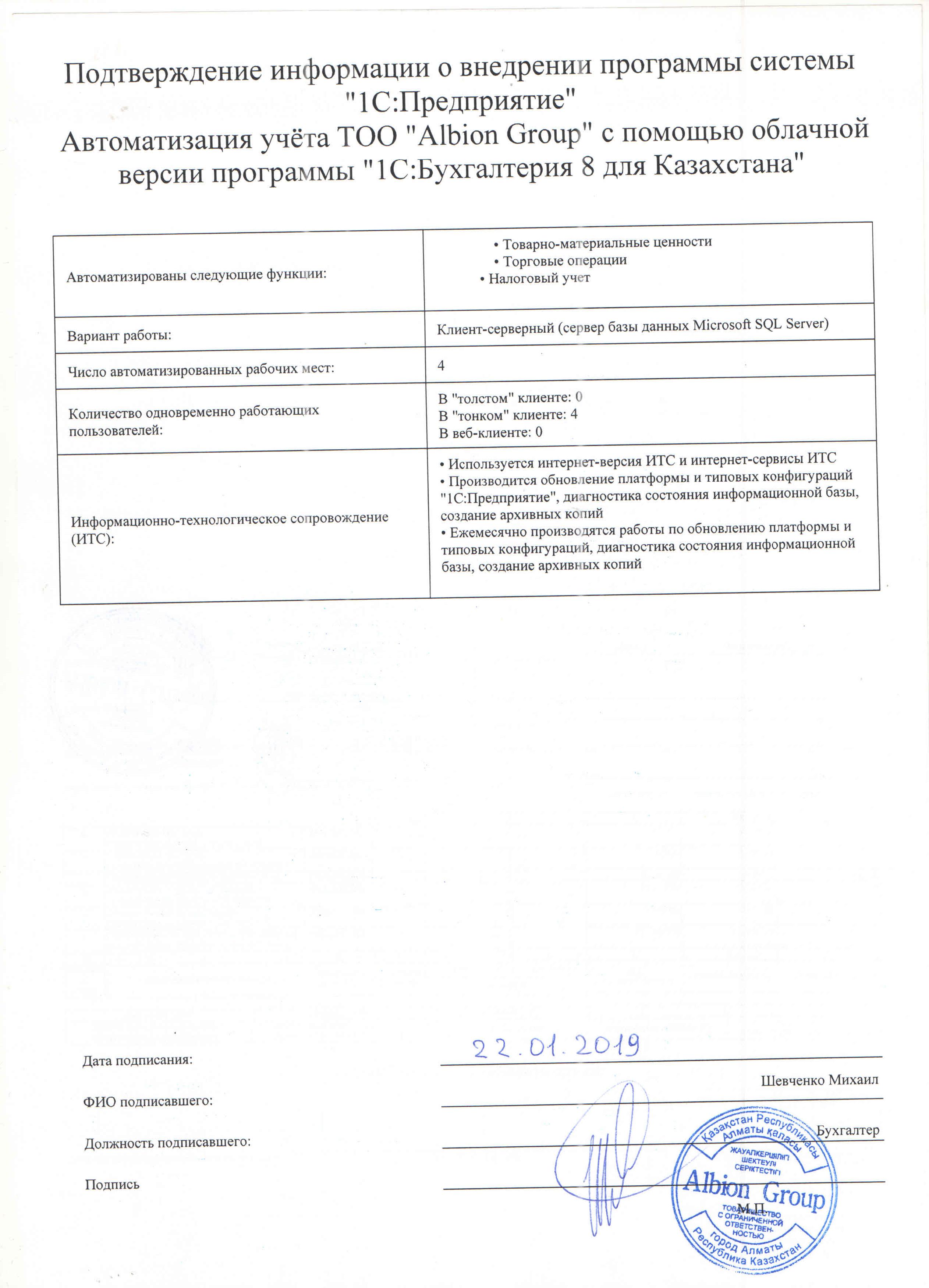 - Ежемесячно производятся работы по обновлению платформы и типовых конфигураций, диагностика состояния информационной базы, создание архивных копий