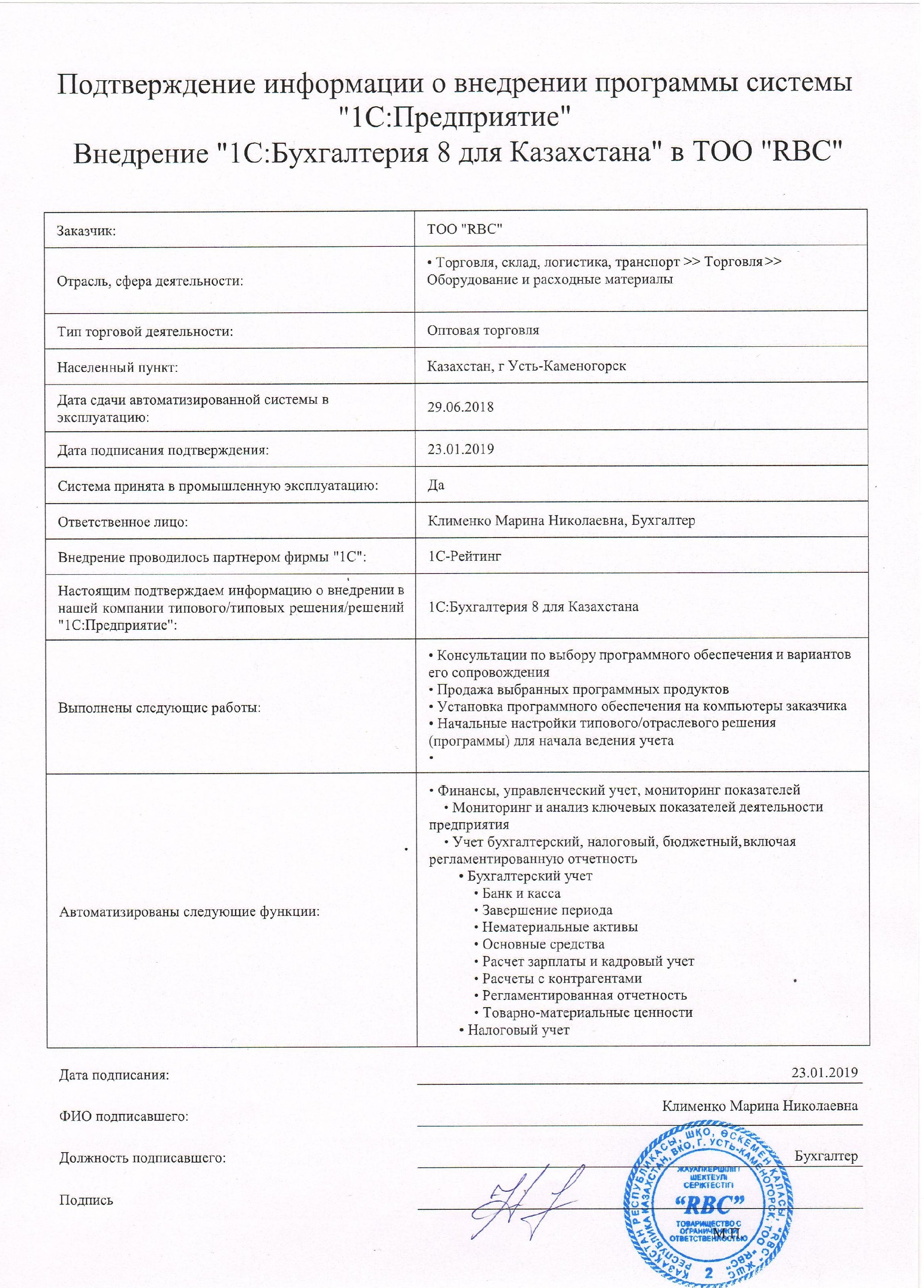 | Внедренное типовое решение: | 1С:Бухгалтерия 8 для Казахстана |