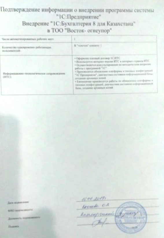 | Внедренное типовое решение: | 1С:Бухгалтерия 8 для Казахстана |