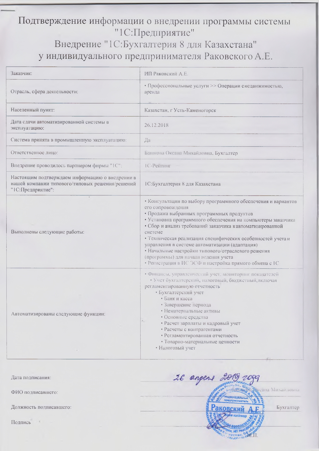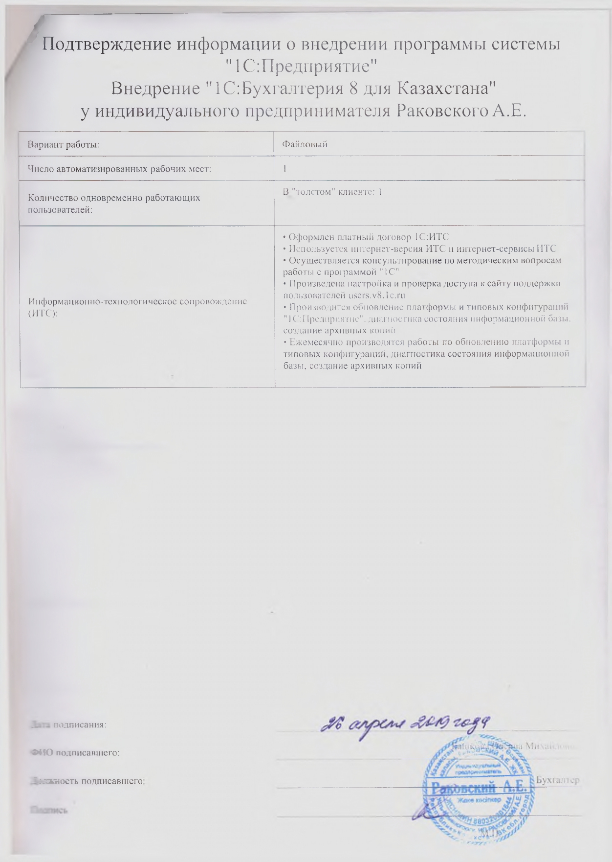| Внедренное типовое решение: | 1С:Бухгалтерия 8 для Казахстана |