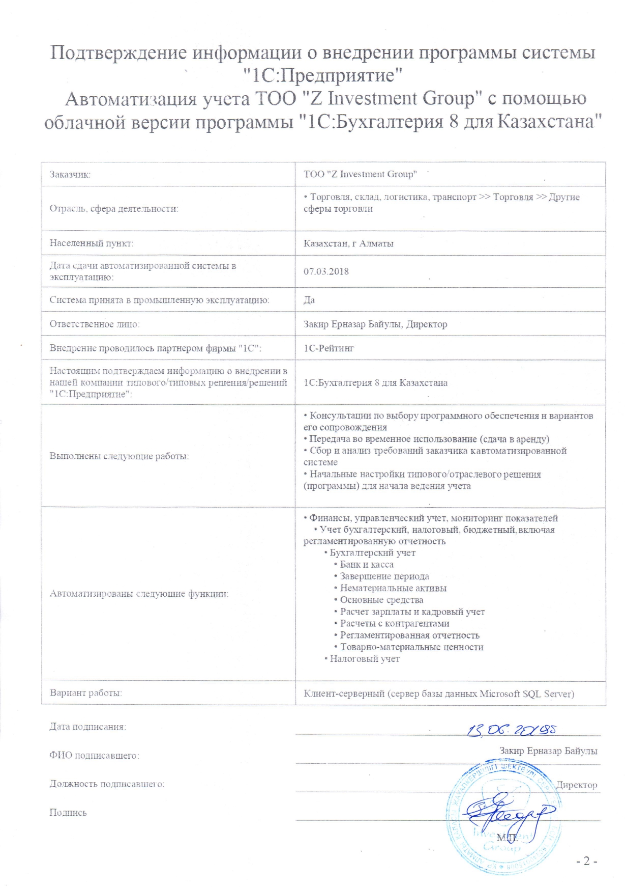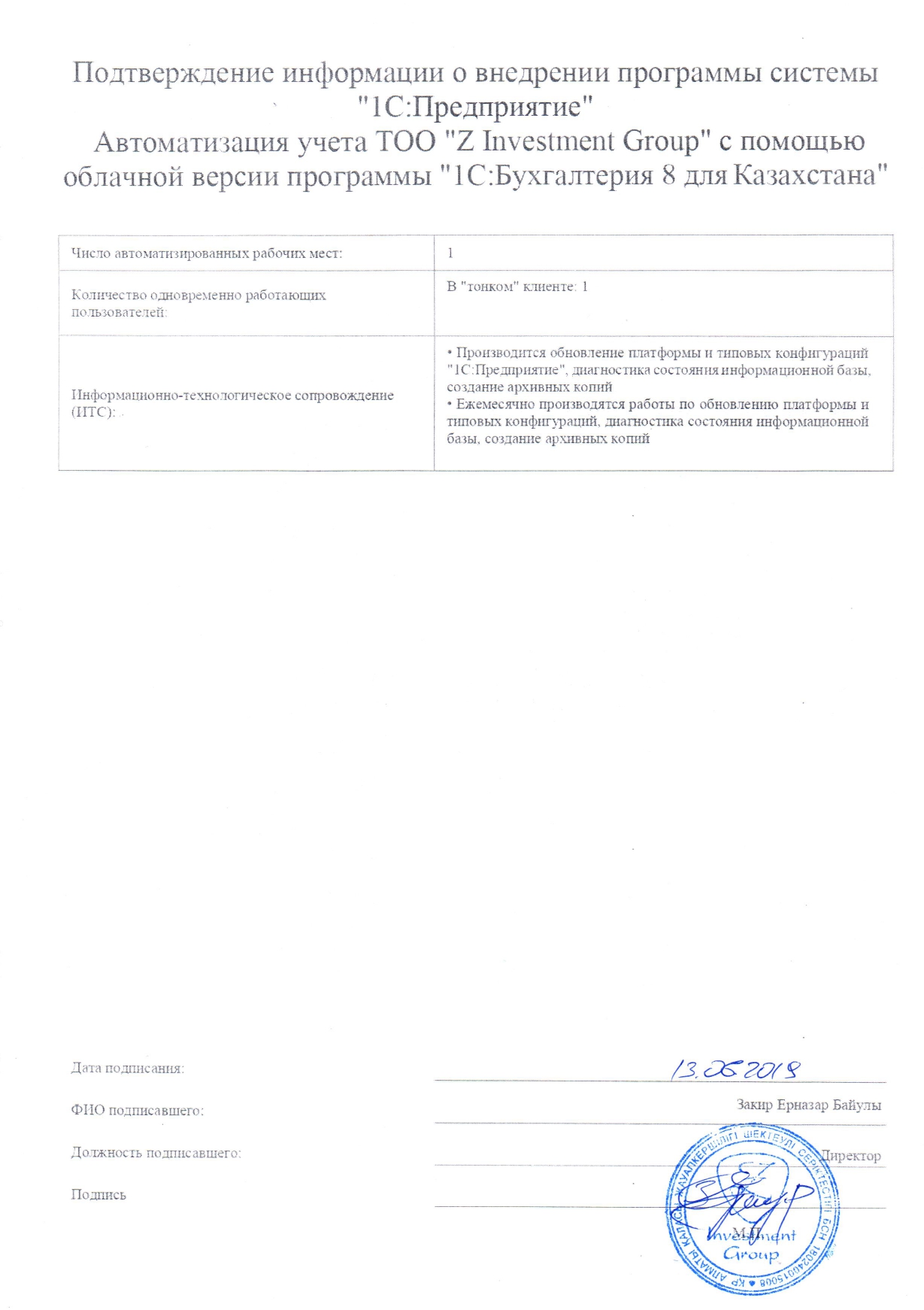 | Арендованное типовое решение: | 1С:Бухгалтерия для Казахстана |